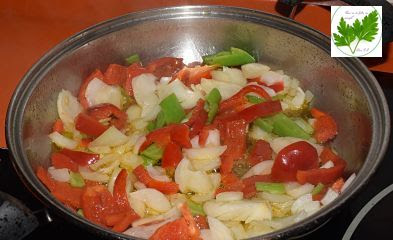 En una cacerola pon aceite a calentar y sofríe la cebolla y pimientos picados.