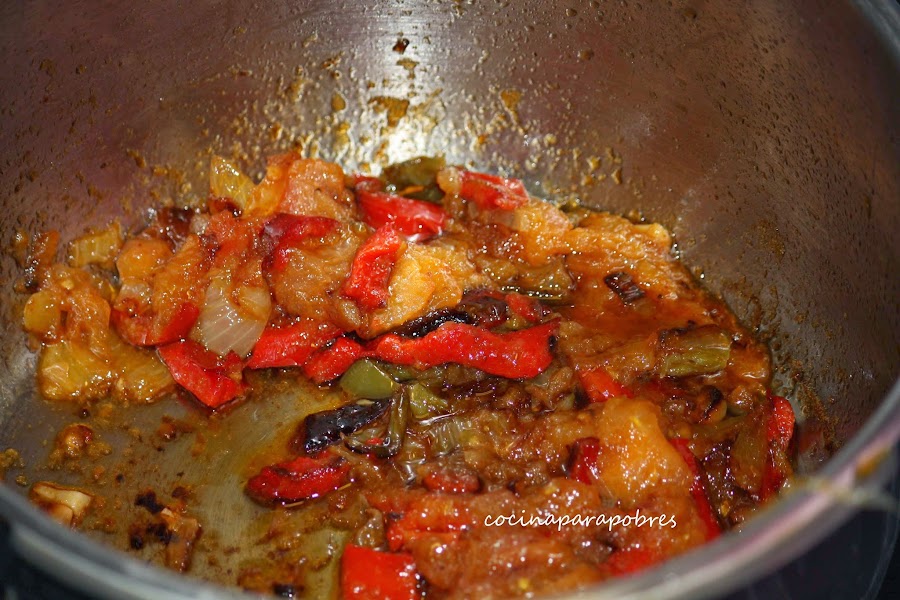 Ponemos al fuego una olla con un poco de aceite donde preparamos la base de nuestro plato, un refrito a base de pimiento, cebolla y pimientos todo troceado .