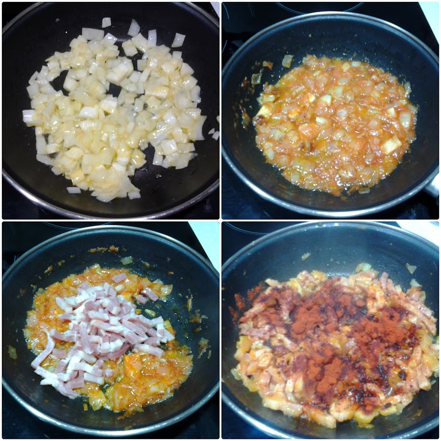 En una sartén ponemos un chorrito de aceite y sofreímos la cebolla, el tomate, el bacon y por ultimo el pimentón.