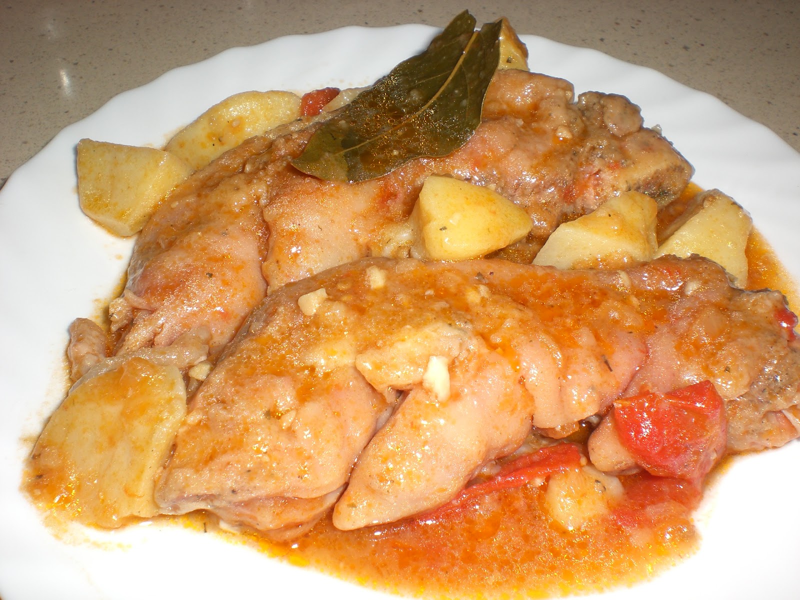 Echaremos sobre ellos la picada que teníamos preparada, el caldo de pollo que hicimos al inicio de la receta, la hojita de laurel y las patatas peladas y troceadas a cuadraditos.