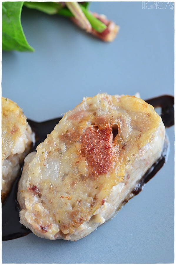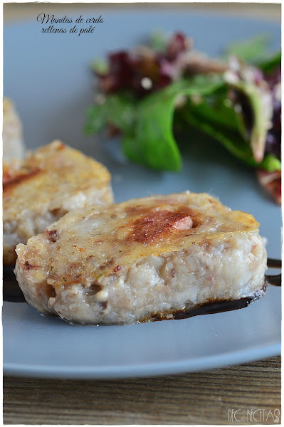 Una vez cocidas las manitas, y templadas para no quemarnos, quitamos los huesos que puedan contener y trituramos toda la carne, no con exceso pero sí un poco y esta mezcla la estiramos encima de un fil transparente formando un rectángulo de como un centímetro de grosor. Encima pondremos una lata de paté por el centro y enrollar hemos con mucho cuidado. Haciendo como si fuera un caramelo y dejando unas horas en el frigorífico para que tengan consistencia.