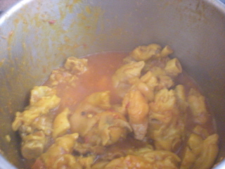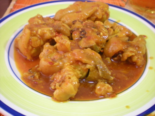 3. A la olla rápida donde están las manitas se le añade el refrito, se echa sal, colorante alimenticio y cayena (opcional) y se vuelve a cerrar la olla durante diez minutos más. Se abre y se sirve.