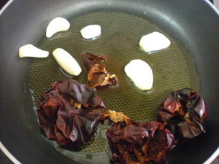 2. En una sartén se ponen dos cucharas de aceite y se fríen las ñoras y los dientes de ajo, se apartan y se pican en la picadora, en el mismo aceite se fríe el tomate, cuando está frito se añaden las ñoras y el ajo picados y un poco de cominos.