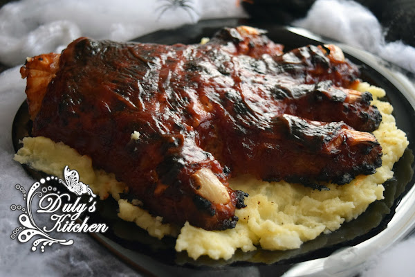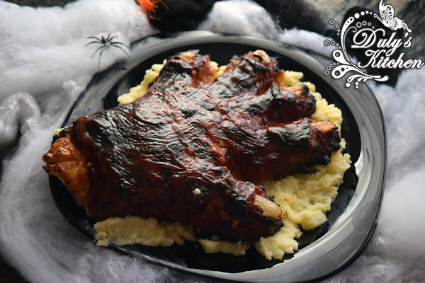 8. Se vuelve a pintar con la salsa barbacoa y se colocan las uñas de cebolla en su sitio. Volveremos a hornear hasta que funda el queso.