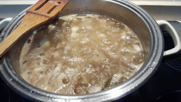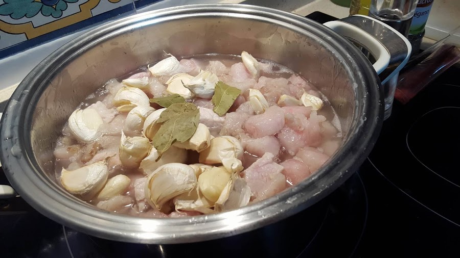 Cuando la pella esté desecha y transparente se saca la carne y laurel.
