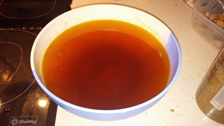 Echamos en una bandeja la zurrapa y encima la grasa. Dejamos reposar y quedará así.