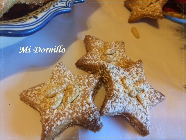 Amasamos bien y con un corta pasta, vamos cortando y poniendo en una bandeja de horno con papel de horno. Metemos en el horno precalentado a 180º durante unos 15 min o hasta que tomen un poco de color, sacar y espolvorear de azúcar glas.