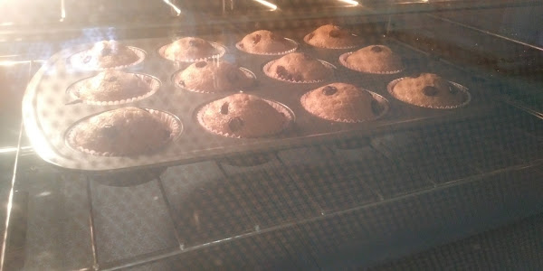 Vaciar mezcla en moldes y espolvorear encima las chispas, nueces o pasas (también puedes incluirlas en la mezcla, cuando agregues los polvos y harinas.