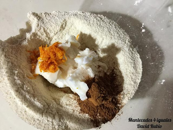 Hacemos un hueco en medio y ponemos en él la manteca de cerdo, que tendremos a temperatura ambiente, y la ralladura junto a la canela si hemos decidido utilizarla.