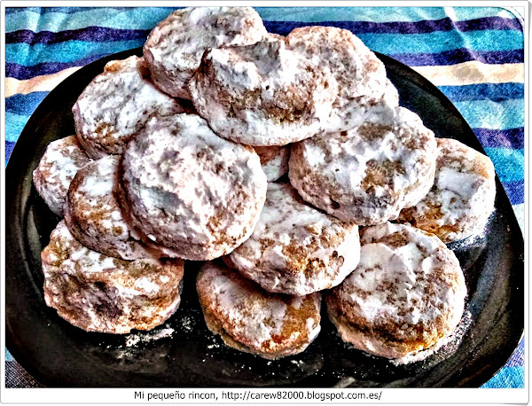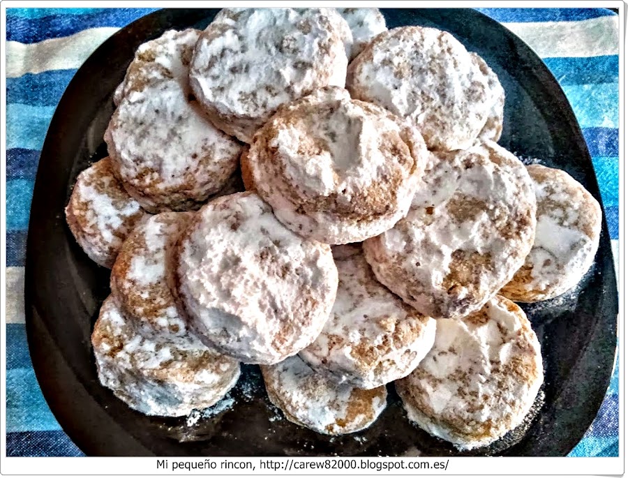 Ahora estiramos con un rodillo hasta 1 cm de grosor y con ayuda de un corta pastas o una copa vamos cortando las piezas y las colocamos sobre una bandeja de horno con una lamina de papel para ello y la metemos sobre unos 25 minutos al horno previamente calentado a 180 grados, una vez doraditos sacamos la bandeja y sin enfriar espolvoreamos azúcar glas y dejamos enfriar.