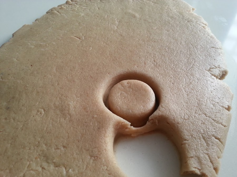 4. - Pasado el tiempo de reposo, encendemos el horno a 200º y extendemos la masa con un rodillo, dejándolas de un centímetro de grosor, y con un vasito o cortapastas, vamos haciendo los mantecados.