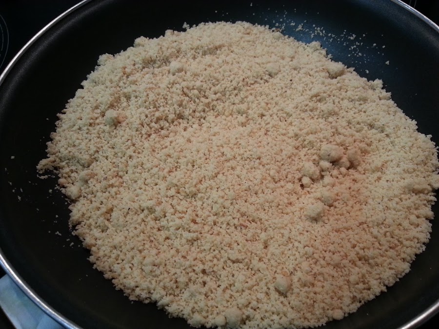 2. - Las almendras molidas las puse en una sartén a fuego bajo, yo lo hice al 5 de 9, para que se tostaran un poco.