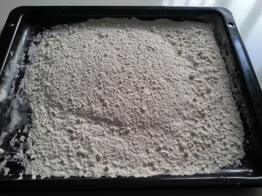 1. - Primero tostamos la harina en el horno a 150º durante 30 minutos, removiendo de vez en cuando. Dejar que enfríe totalmente. Al perder humedad la harina pierde peso, por lo que es conveniente poner 400 gr o más a tostar, y guardamos la que sobre.