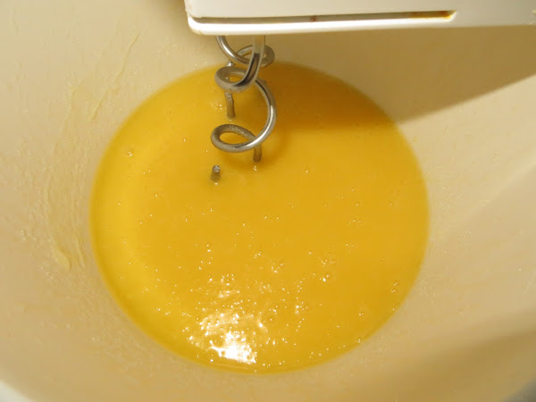 Lo primero que hacemos es derretir a la mantequilla, mezclarla con los 200 gramos de azúcar y batirlo. Cuando ya está bien mezclado, añadimos uno de los huevos enteros y las tres yemas del resto y continuamos batiendo.