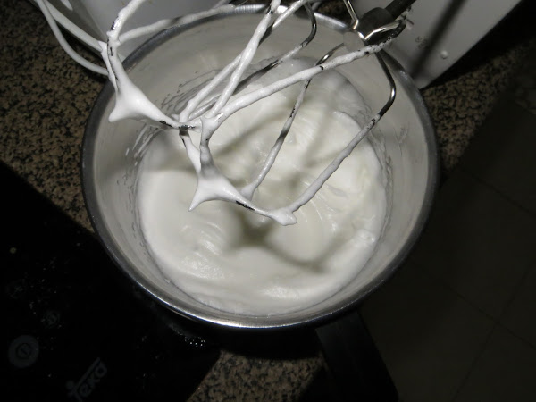 Mientras tanto tamizamos el sobre de levadura y los 200 gramos de harina de repostería, luego lo vamos añadiendo poco a poco a la mezcla. Por otro lado, montamos las claras a punto de nieve y añadimos las dos cucharadas soperas de azúcar para hacer un merengue. A continuación, mezclamos el merengue con el resto de la mezcla.
