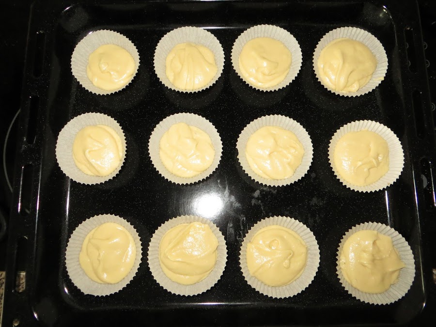 Colocamos los papeles en la bandeja del horno, pueden ser papeles típicos de los mantecados, aunque como yo no tenía utilice los de magdalenas. Llenar los moldes a la mitad y meterlos al horno, previamente precalentado a 180º, durante 15 minutos con calor arriba y abajo. Los sacamos, los dejamos enfriar y ya están listos para comer.