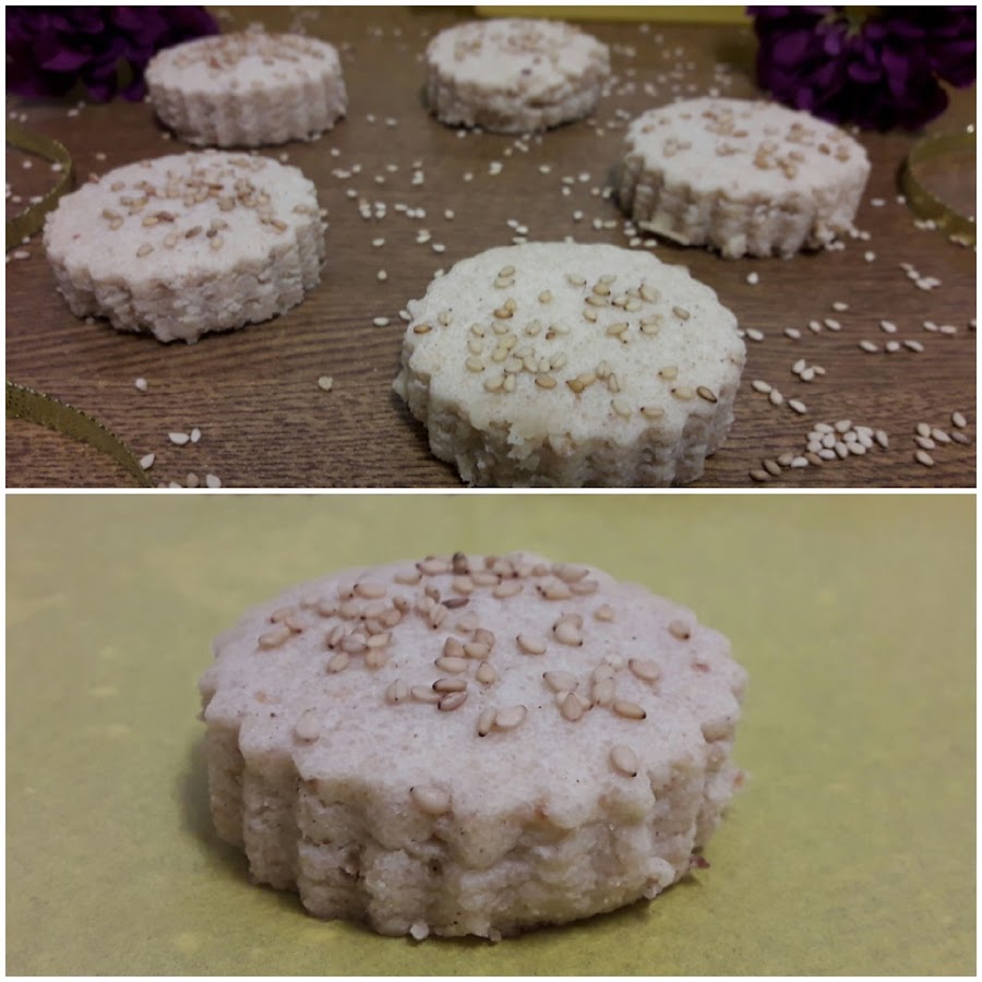 Extendemos la masa con ayuda de un rodillo, entre dos laminas de film o sobre dos papeles de hornear, hasta que tenga un grosor aproximado de 15 centímetros. Con un cortapastas de unos 4 centímetros de diámetro, cortamos porciones de masa y las ponemos en la bandeja del horno cubierta con papel vegetal. Pintamos con la manteca de cerdo derretida y espolvoreamos semillas de sésamo o ajonjolí por encima.