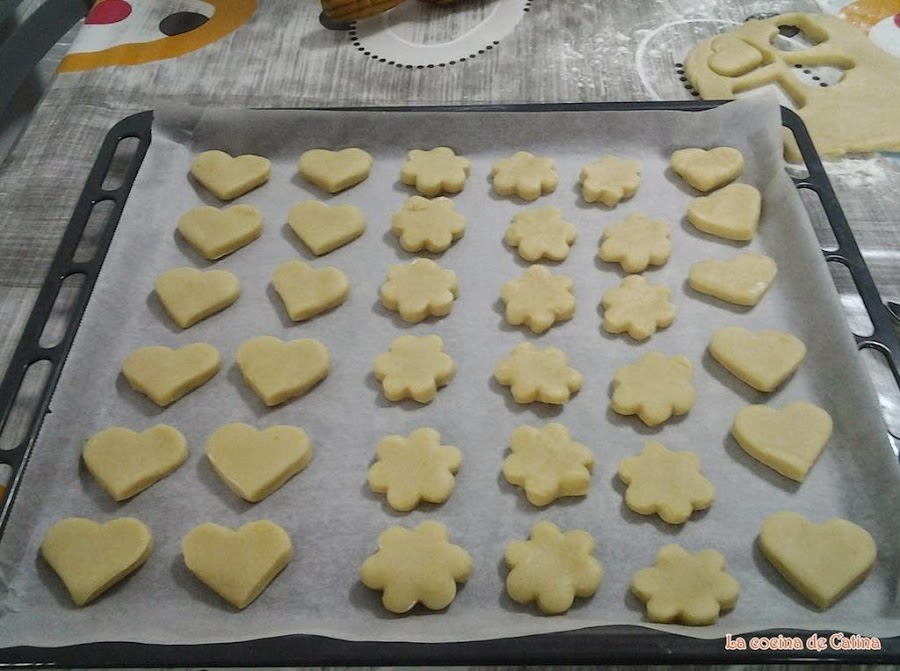 Precalentar el horno a 180 grados. Enharinar la mesa de trabajo y extender la masa con el rodillo dejándola de un centímetro de espesor, cortamos con uno o varios cortapastas (a gusto de cada uno), para obtener mantecados de diferentes formas.