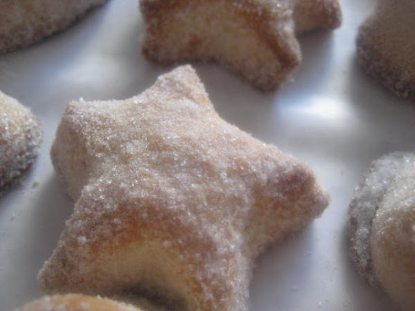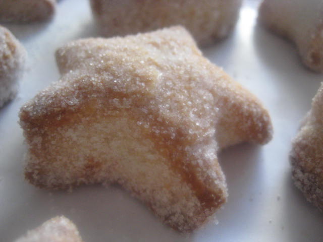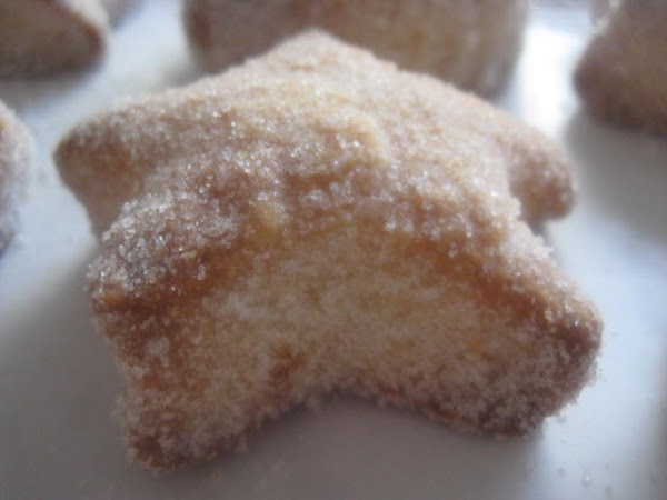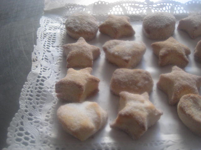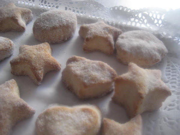 Preparación: Se mezclan todos los líquidos y la manteca, se añade el impulsor y se mezcla todo bien. A continuación añadir de golpe 250 gr. de harina y amasar. Luego ir agregando la harina restante poco a poco según veamos la masa. Tiene que quedar una masa esponjosa, que no se peque a las manos pero que al mismo tiempo sea manejable. Dejar reposar la masa obtenida en la nevera durante 12 horas. Estirar la masa a 1 cm. de grosor más o menos y cortar de la forma deseado. Colocar en bandejas de horno y dejar reposar 15 minutos. Pasado éste, cocer en el 190º C unos 20 minutos aprox. Al sacarlos del horno y, en caliente, rebozar muy bien en azúcar granillo (emborrizar). Esperar que estén bien fríos para degustarlos, es de las masas que al pasar los días están mejor; es lo que hace la manteca en estos dulces tan ricos y tradicionales