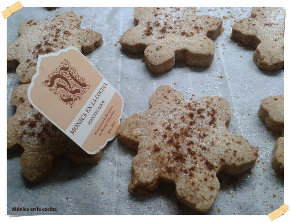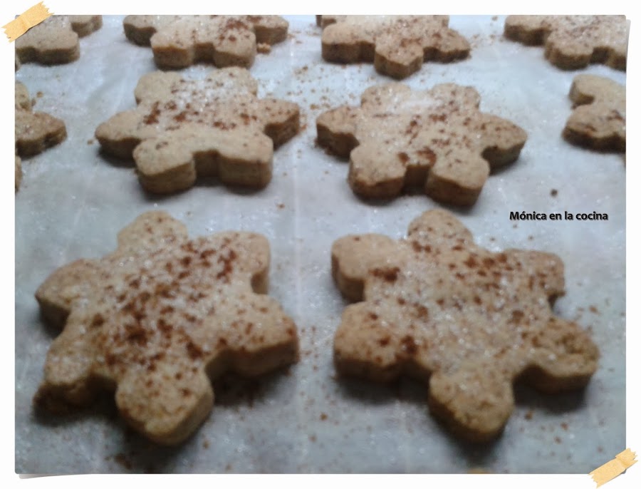 Cortarlas con cortapastas de distintas formas. Ponerlos sobre una placa de horno y hornear durante unos 20 min. hasta que empiecen a dorarse, pero sin que queden oscuros. Sacarlos y espolvorearlos con azúcar y un poco de canela.
