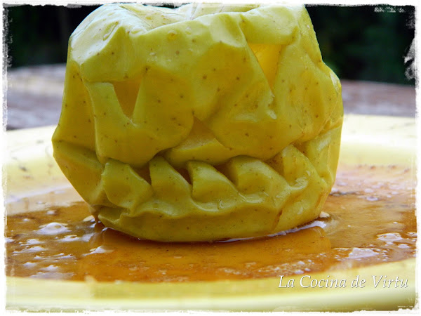 Es muy fácil. Descorazonáis una manzana, con un cuchillo afilado, con la punta le haceis una raja y vais haciéndole los dientes ojos, nariz, igual que a una calabaza.
