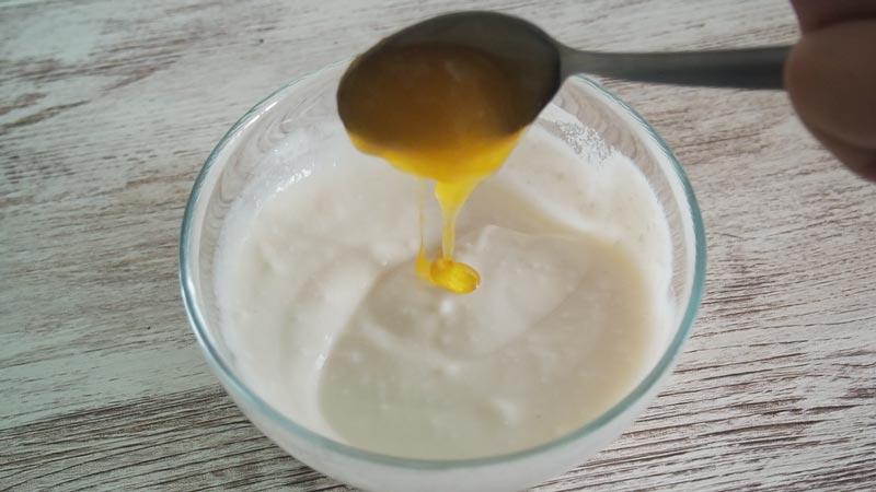 Pasamos a preparar la salsa. En un recipiente vertemos un yogur natural. Un poco del jugo de la manzana que nos ha quedado en el papel de aluminio. Un poco de esencia de vainilla, aunque esto es opcional y una cucharada de miel.