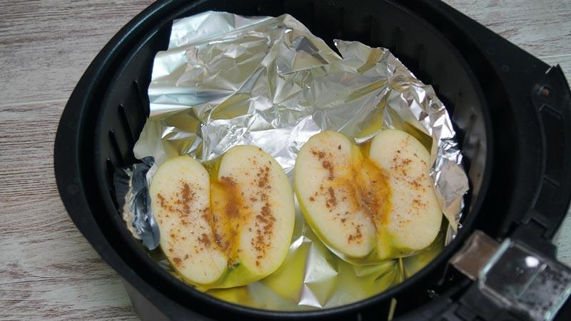 Lo primero que voy a hacer será calentar la freidora de aire que es donde yo he preparado la manzana asada. Es como una especie de horno. Pero tú puedes prepararla en el horno, en microondas o incluso en sartén. He programado 5 minutos y la he dejado calentar.Cuando la freidora esté caliente se apagará el piloto verde. Entonces abrimos la cubeta y le ponemos en el fondo y trozo de papel de aluminio o papel plata, ya que la manzana al ser asada va a soltar su jugo. Este jugo lo vamos a aprovechar para preparar la salsa que le echaremos después por encima.