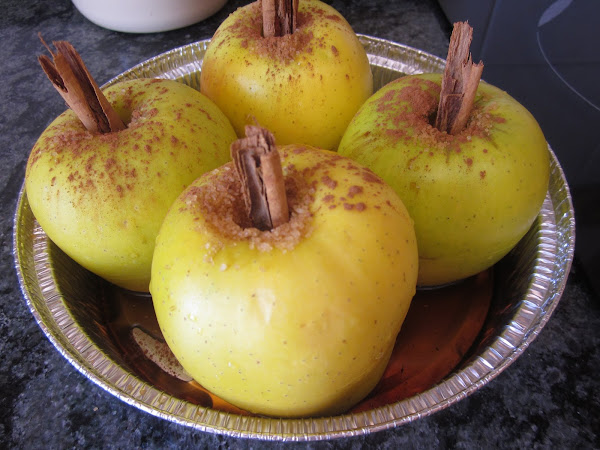 Las lavamos bien, le quitamos el interior con un aparatito que venden muy económico, y les hacemos un corte en la piel, a la mitad de la manzana y alrededor ( esto es para que la piel no se reviente y se puedan servir bonitas).