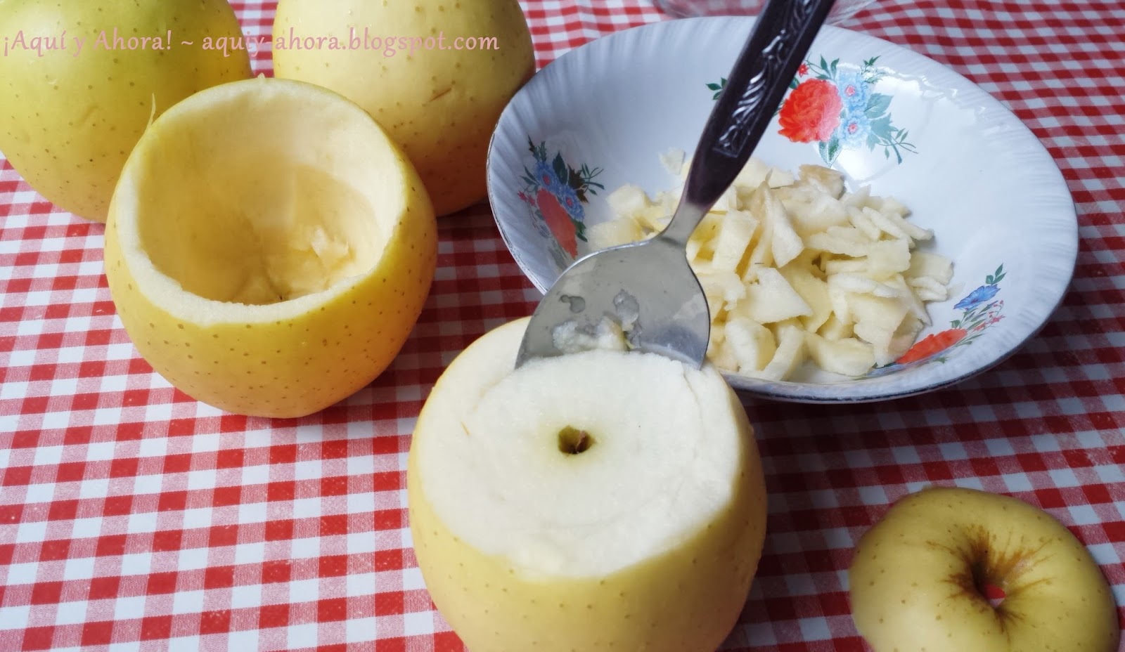 Elaboración:Lavamos y secamos bien las manzanas. Con la ayuda de un cuchillo cortamos la parte superior de la manzana, en el interior hacemos unos cortes con el cuchillo y con una cuchara sopera sacamos el interior de la manzana y lo cortamos en dados pequeños.
