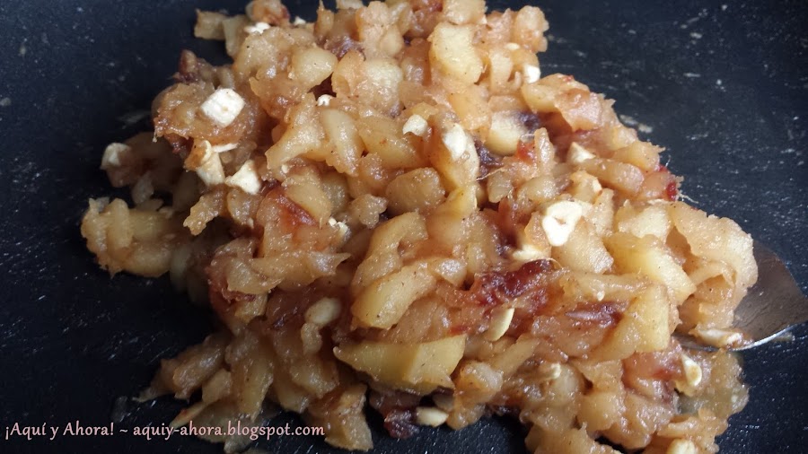 Ponemos una sarten al fuego, añadimos mantequilla sin sal y un chorrito pequeño de aceite de oliva. Cuando la mantequilla esté derretida añadimos los dados de manzanas y cuando estén medio tiernas agregamos el azúcar moreno mezclamos bien y añadimos el medio vaso de agua. Dejamos que empiece a caramelizarse las manzanas con el azúcar, notaremos que el agua se ha evaporado así que añadimos la esencia de vainilla y la canela. Mezclamos bien todos los ingredientes y lo dejamos unos minutitos haciéndose.