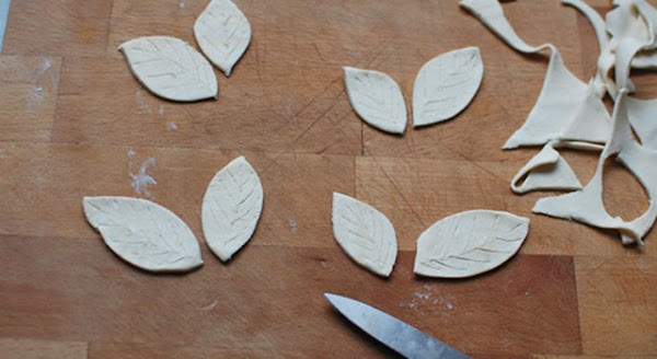 Envolvemos la manzana con la masa ajustándola a la forma redondeada. Para cubrir el trozo de arriba, cortaremos un poco más de masa y le daremos forma de hojas y tallo, simulando la forma de la manzana en el árbol.
