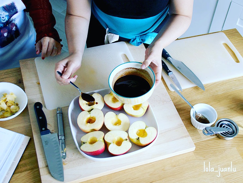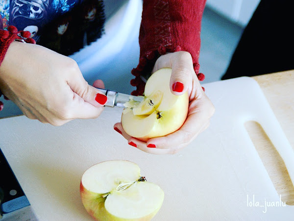 En un plato hondo o cuenco colocamos una manzana o media, con un tenedor y un cuchillo, aunque también se pueden comer con una cucharita.