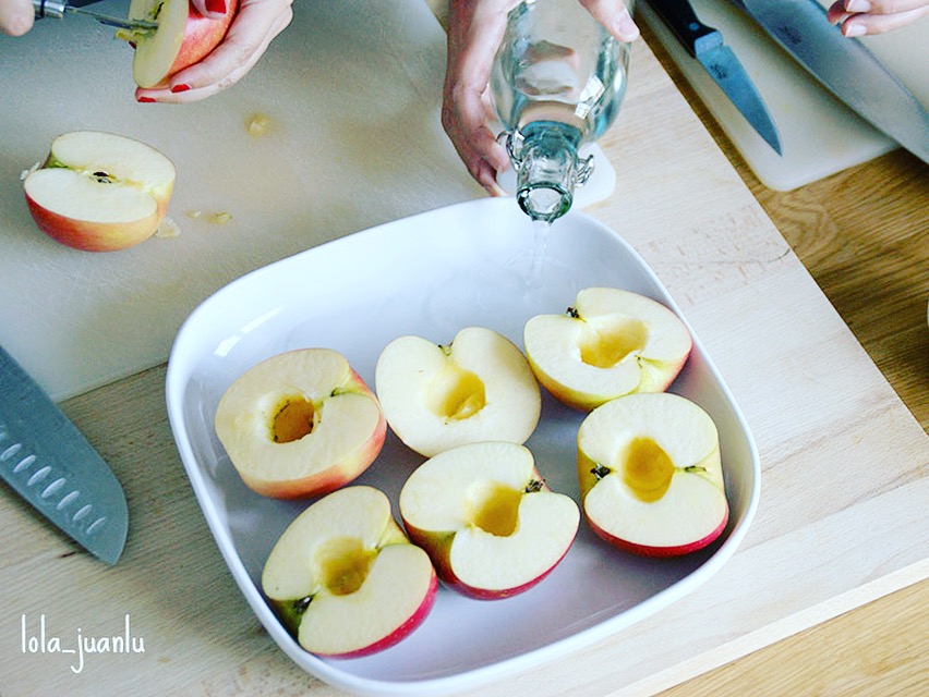 Una vez que hemos elegido la fuente de horno que vamos a utilizar, cubrimos con agua el fondo y colocamos las manzanas en el interior de la fuente de horno con la parte cortada hacia arriba. Repartimos la mezcla que hemos preparado cubriendo la parte cortada de las manzanas.