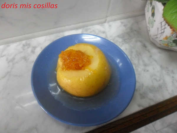 Ponemos a máxima potencia el microondas las manzanas y vamos mirando hasta verlas cocidas pero no desechas. Pinchamos con una aguja hasta verlas tiernas, retiramos y estando calientes agregamos una cucharada rasa de confitura de naranja amarga.Dejamos templar y a degustar un postre delicioso.