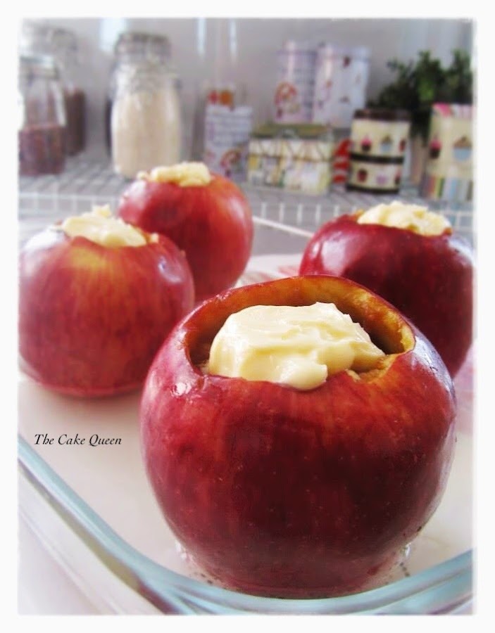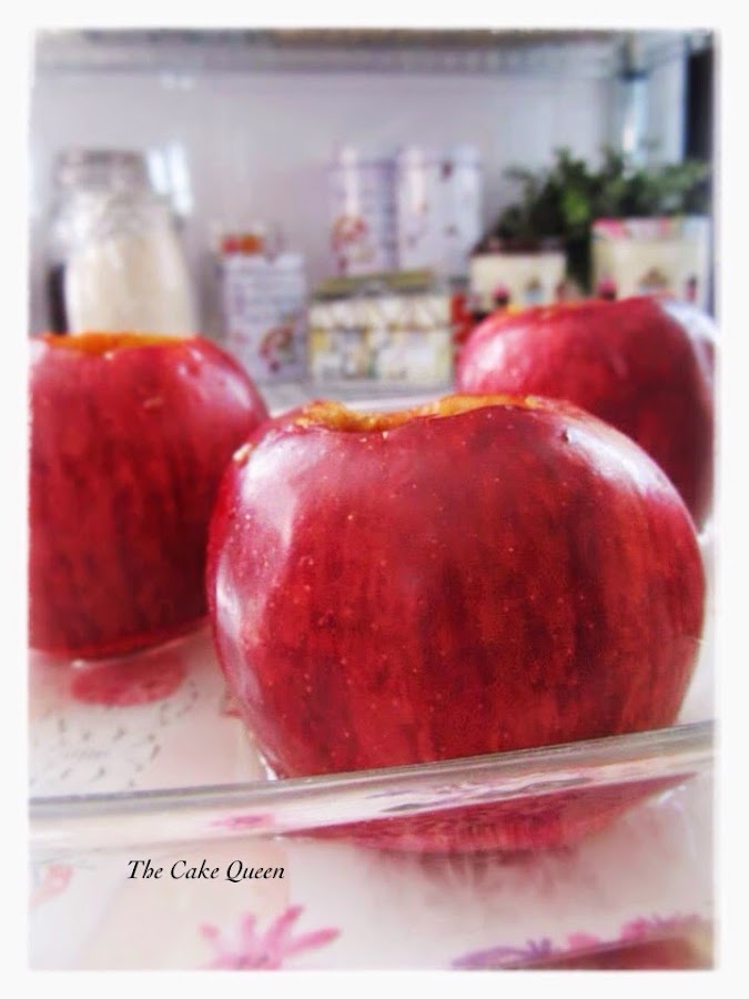 7. Colocamos las manzanas rellenas en una fuente de vidrio para horno. La fuente debe de tener agua para que no se queme el zumo que vayan soltando las mismas.