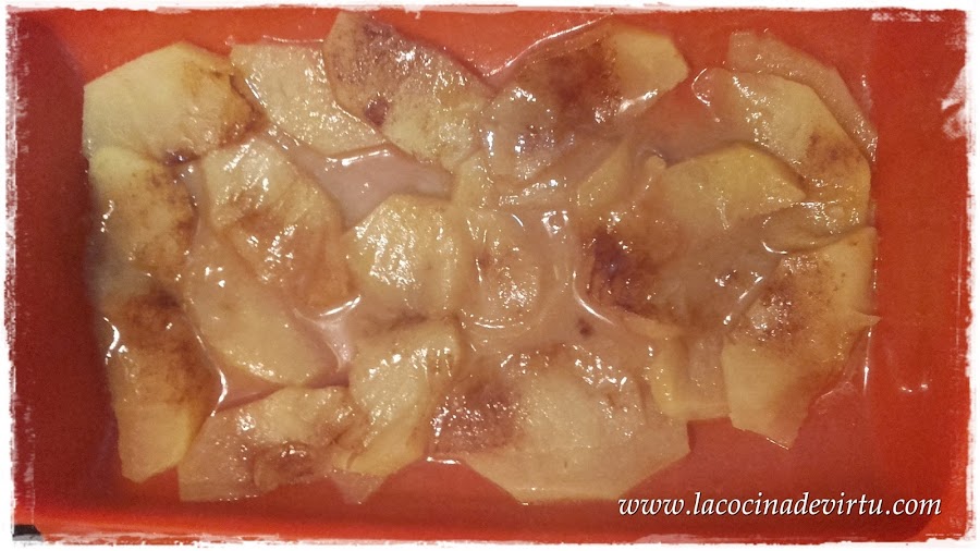 Pon la manzana en el estuche Lekue (u otro recipiente apto micro) pon la mantequilla por encima cortada a trocitos, espolvorea con canela y azúcar.