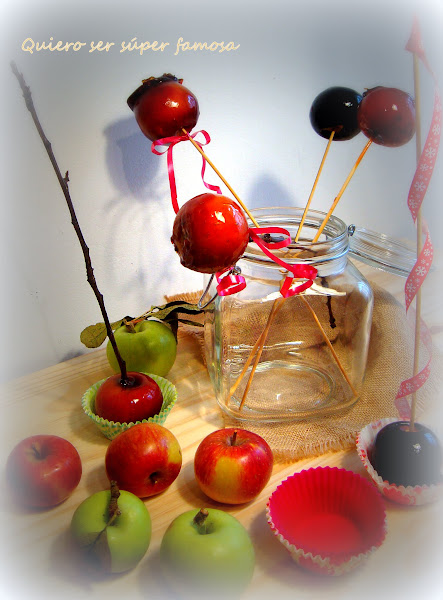 - Lavar y secar bien las manzanas. Quitar el rabito. Pinchar el palo para brocheta por el lado del rabito hasta más o menos la mitad.