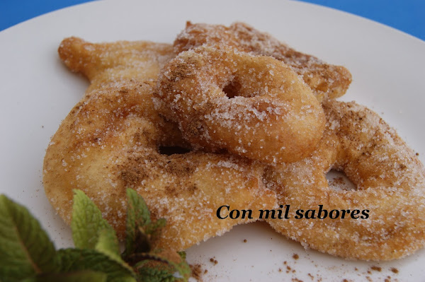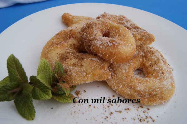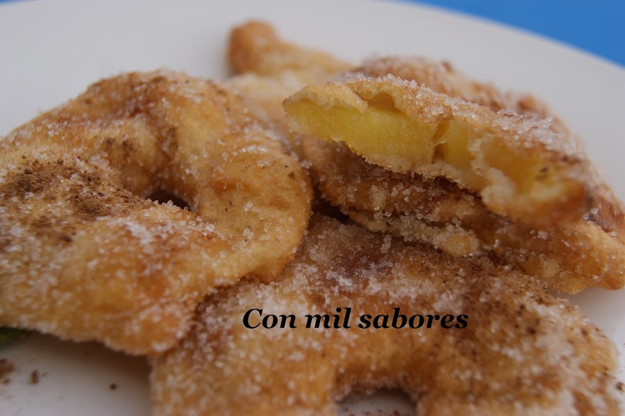 En un bol ponemos la harina, el bicarbonato y mezclamos bien, añadimos las yemas de huevo ,la leche y la sal, batimos bien con unas varillas para unir todos los ingredientes. Montamos las claras a punto de nieve y las incorporamos a la mezcla con cuidado , con movimientos envolventes para que no se bajen. Conseguiremos una masa de aspecto esponjoso muy parecida a la de los bizcochos. Sacamos las rodajas de manzana las secamos ligeramente en papel de cocina y las introducimos en la masa. Ponemos aceite de girasol a calentar en una sartén, cuando esté en su punto ven papel de cocina para que absorba el exceso de grasa, por último las emborrizamos en azúcar y canela. Buen provecho amigos!!!!.