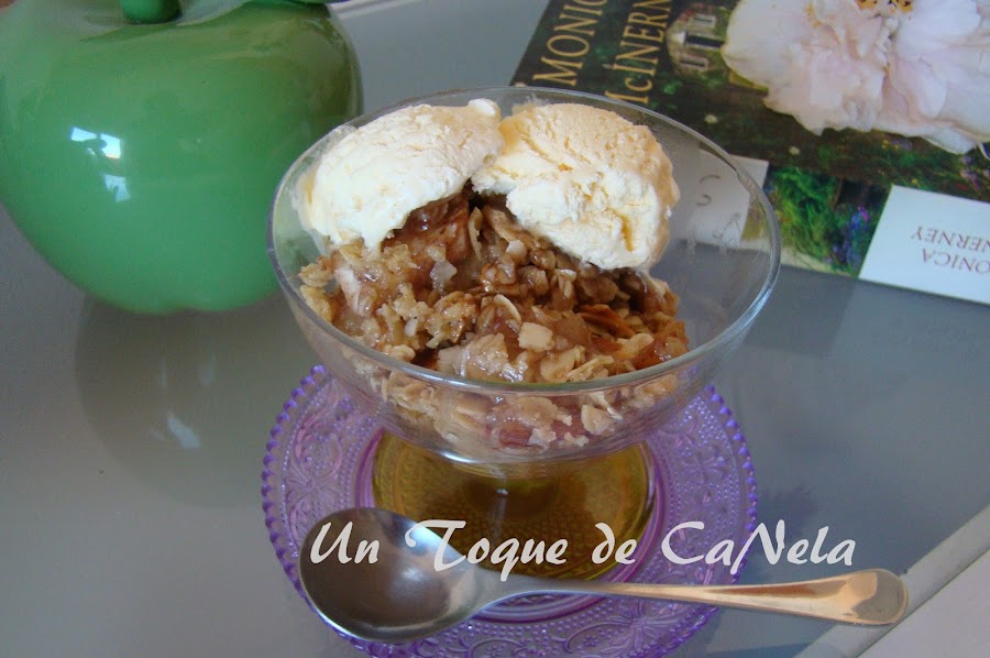 Servir templado con helado al gusto. Le puse de vainilla porque con la canela pega muy bien.