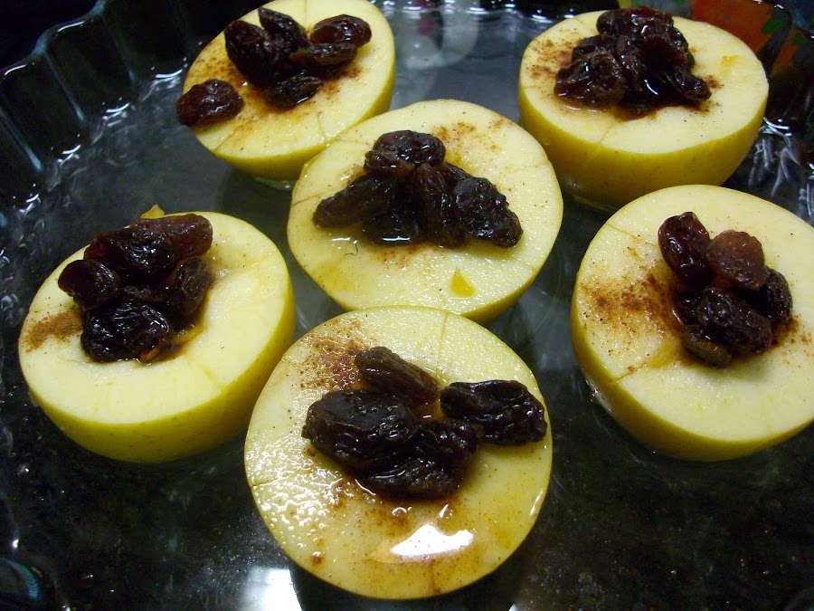 cortamos las manzanas a lo ancho por la mitad..y las vaciamos un poco.....le hacemos unos cortes poco profundos en la piel..para que no explote.....echamos unas gotas de edulcorante y de canela....las pasas...y el vasito de vino en el fondo del recipiente..y las metemos en el microondas...7 minutos....