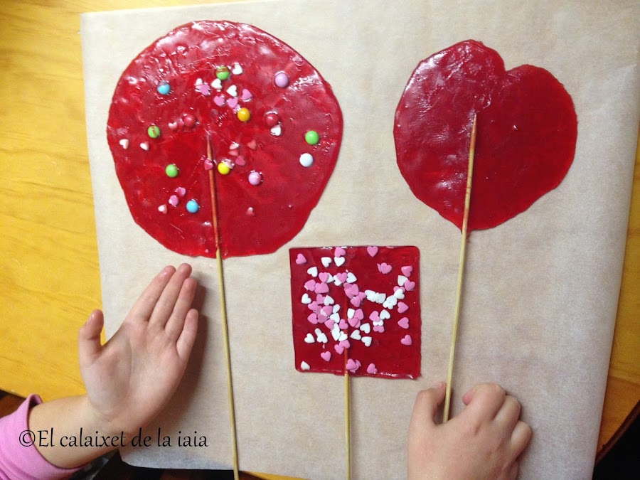 para ello prepararemos otro papel enmantecado, colocaremos un palo de brocheta y alrededor del mismo iremos poniendo el caramelo, que podemos dejaqr como caiga o antes de quese enfríe, darle la forma deseada y espolvorear con caramelitos...