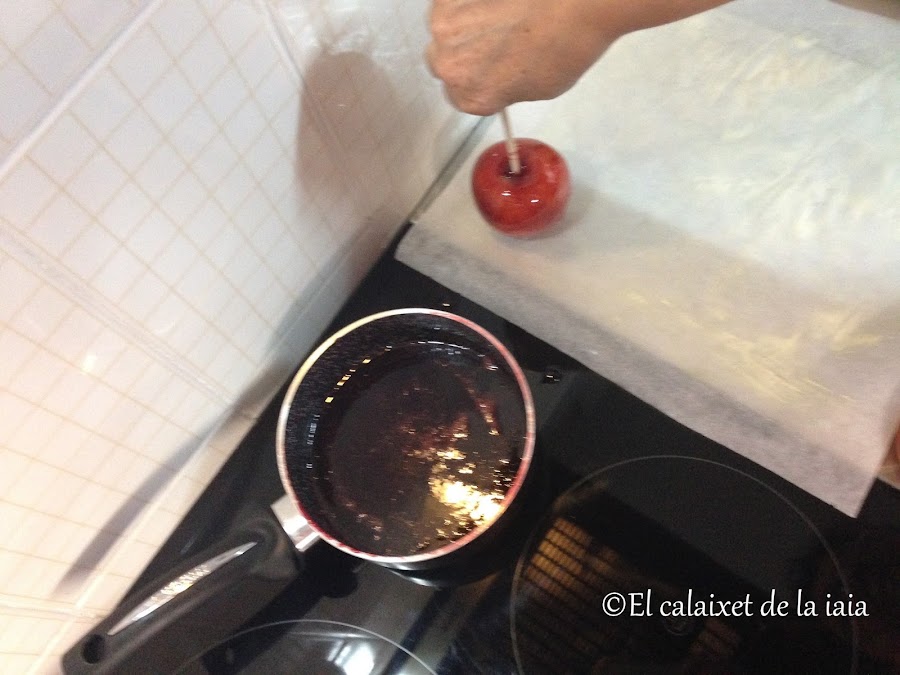 Cuando el caramelo alacance los 150º o veamos que ya está listo viendo que se hace ebra, apagamos el fuego, y volteamos dentro del cazo cada manzana para que quede completamente cubierta