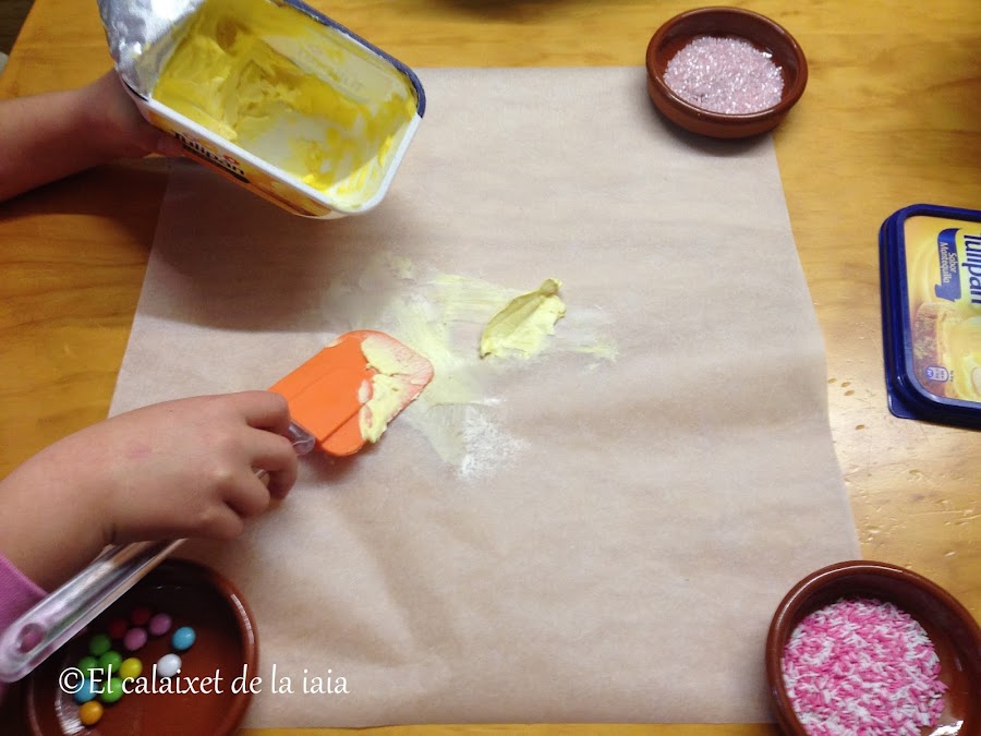 mientras tanto, prepararemos el papel donde colocaremos las manzanas para que se enfrien, ha de ser un papel sulfurizado o de horno,y lo untaremos con mantequilla o margarina para evitar que se nos pegue el caramelo de la manzana
