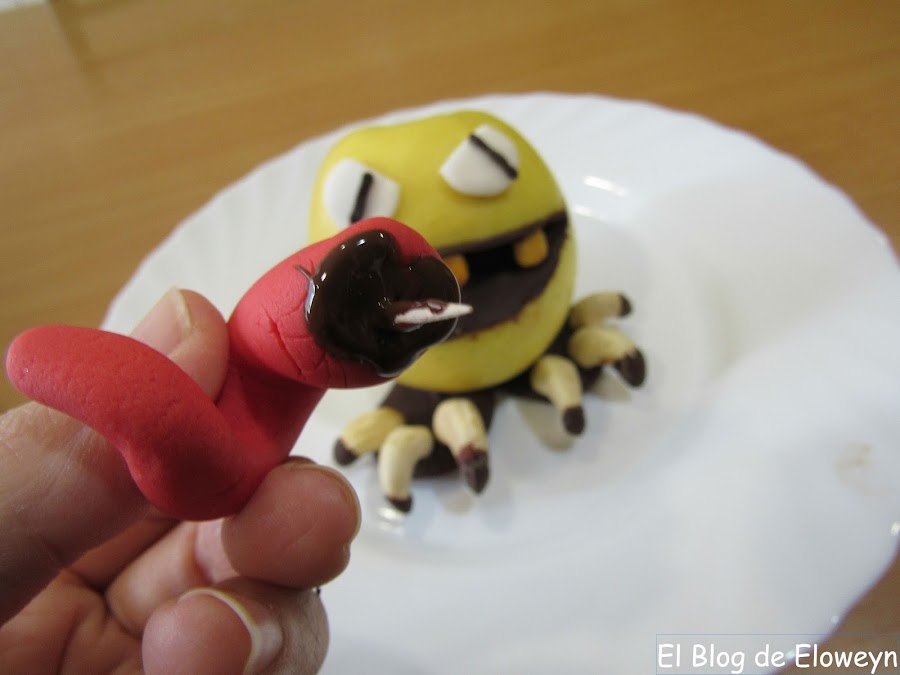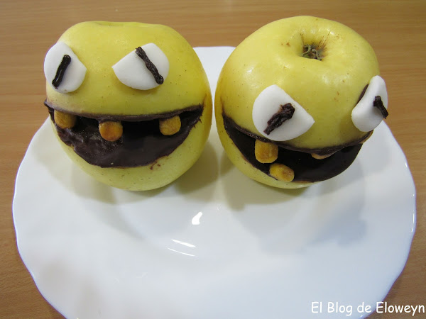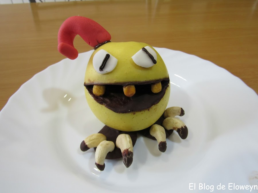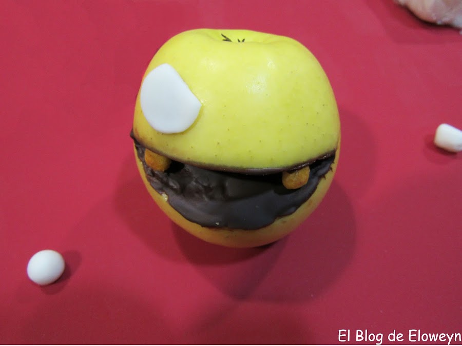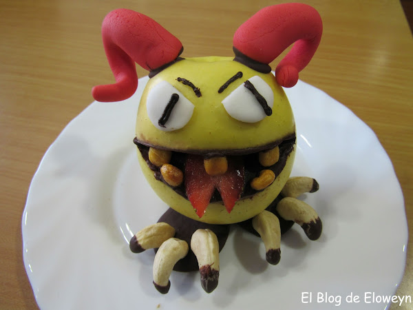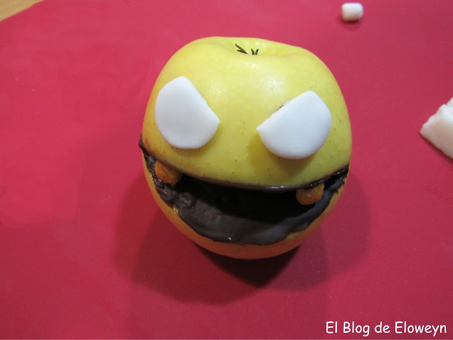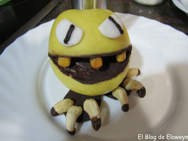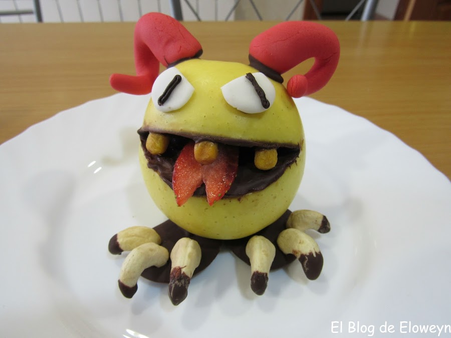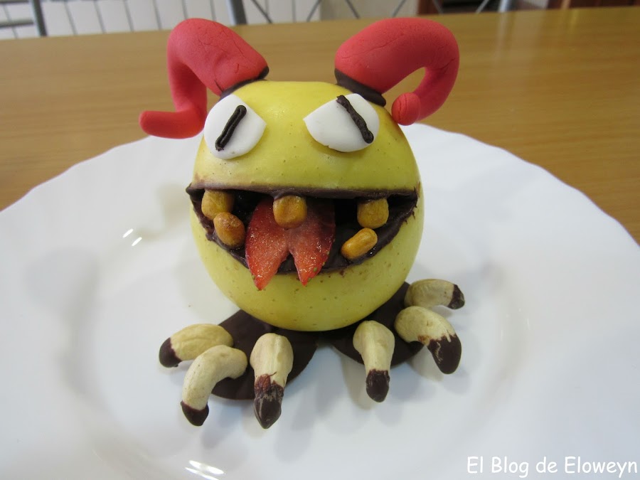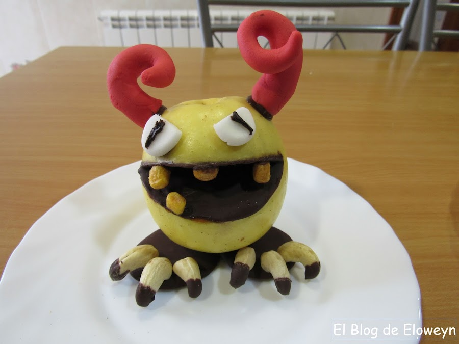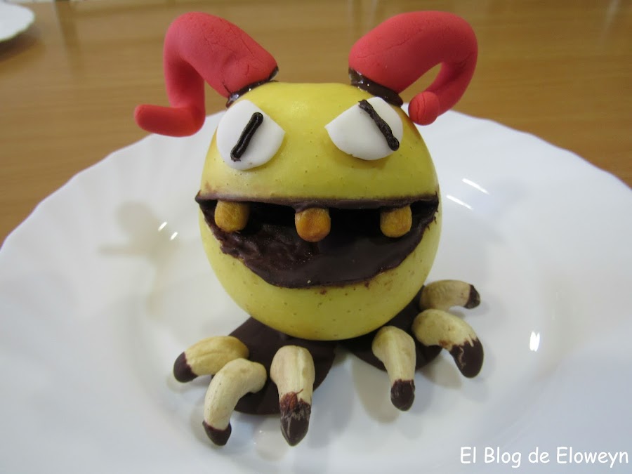 Este año quería preparar un demonio de manzana bañada en chocolate y con cuernos. Hice varios experimentos fallidos (que no sé si colgar en mi blog de pifias en la cocina, porque son tan penosos que no sé si vale la pena). En un principio quería hacer el bicho con un cuarto de manzana bañada en chocolate, pero quedaba tan mal que al final desistí del baño de chocolate y lo hice con una manzana entera, porque si usaba un cuarto de manzana, la boca se llevaba la mayor parte del trozo... jajaja.