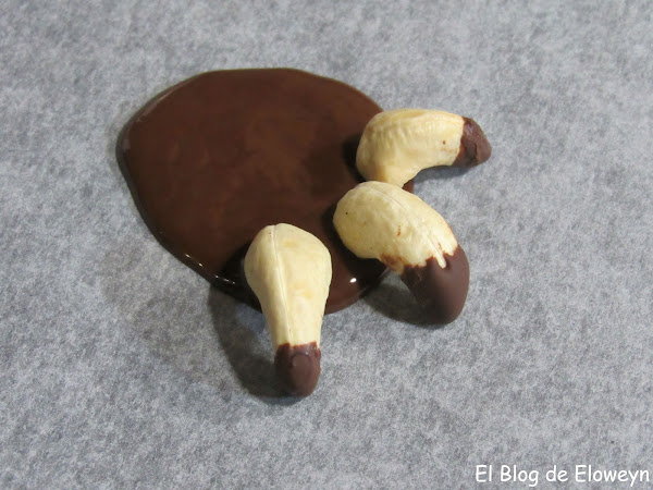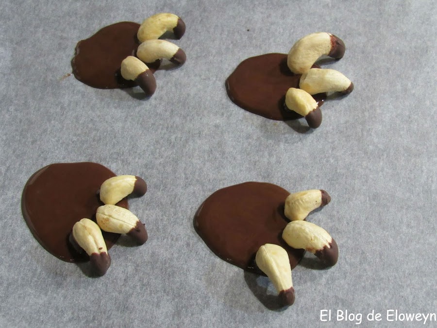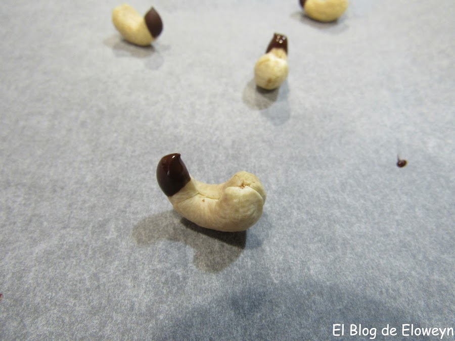 Como podéis ver, las garras están ordenadas por tamaño. Esta garra correspondería al pie izquierdo, porque tiene la garra más larga en la parte derecha... jajaja. Es muy importante que cuando seleccionéis los anacardos, se puedan aguantar en esta posición, ya que de esta forma, los ponemos sobre el pie todavía derretido y sólo tenemos que esperar a que se seque el chocolate.
