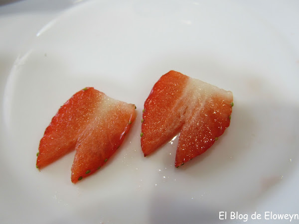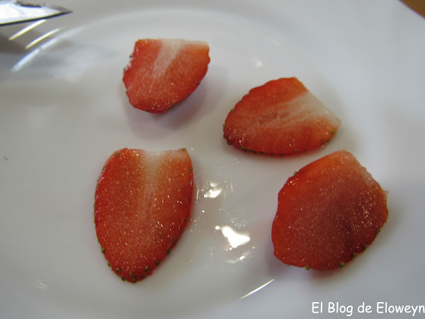 Cortamos la fresa en láminas. Cogemos las láminas del medio para hacer las lenguas.