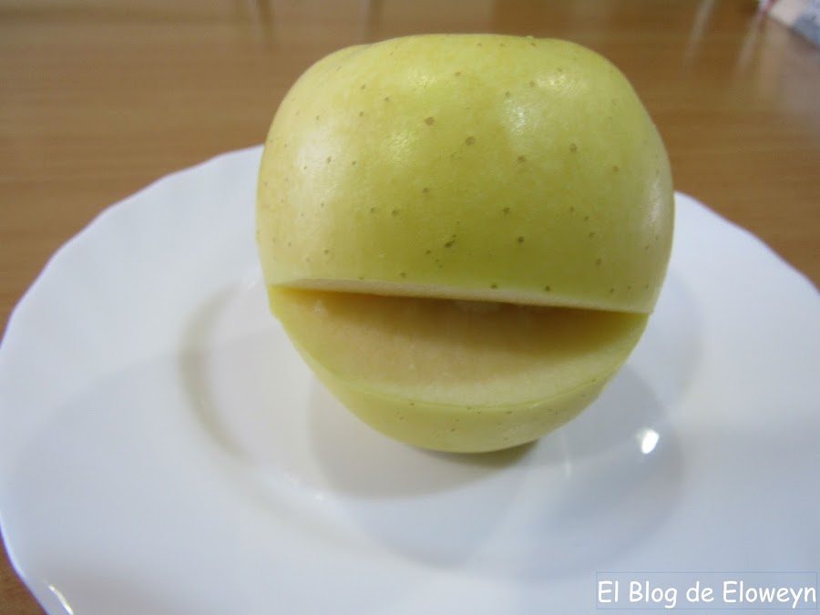 Quitamos el rabito a la manzana, en el caso de que lo tenga. Lavamos bien la manzana y la secamos. Procedemos a hacerle la boca haciendo dos cortes. Uno perpendicular a la manzana más o menos por la mitad y otro sobre el corte perpendicular, pero esta vez en diagonal. Tiene que quedar más o menos así: