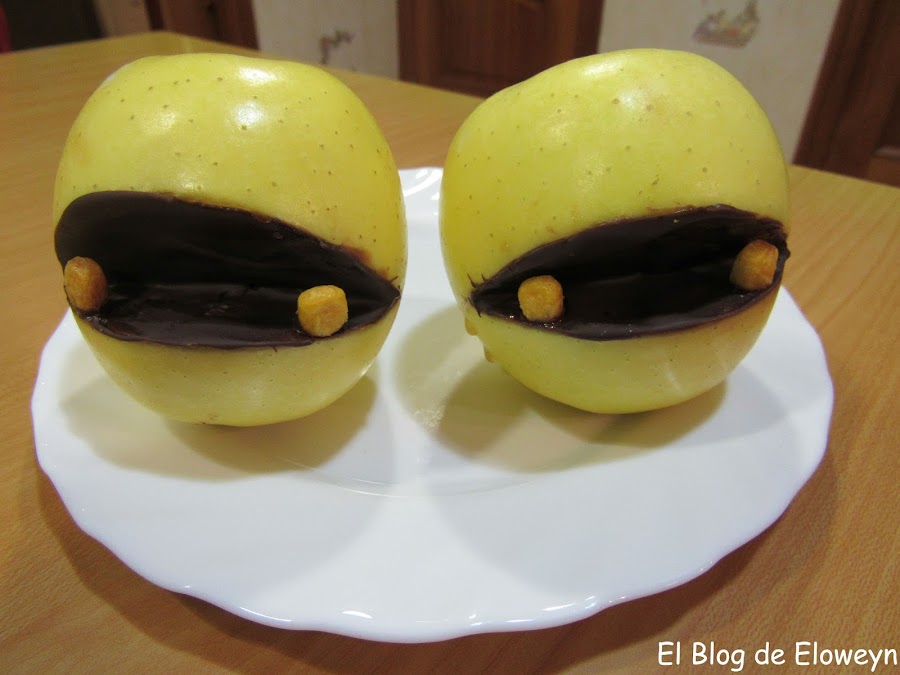 Repetimos el proceso con la otra manzana y seguimos con los cuernos. Yo les puse un poco de chocolate derretido para que se pegasen mejor, pero igual no hacía falta.