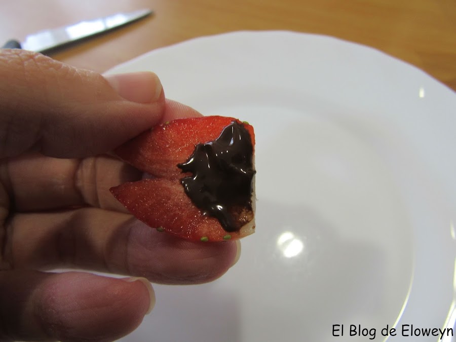 Ponemos un poquito de chocolate en la parte más gruesa de la fresa.