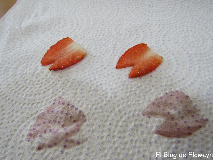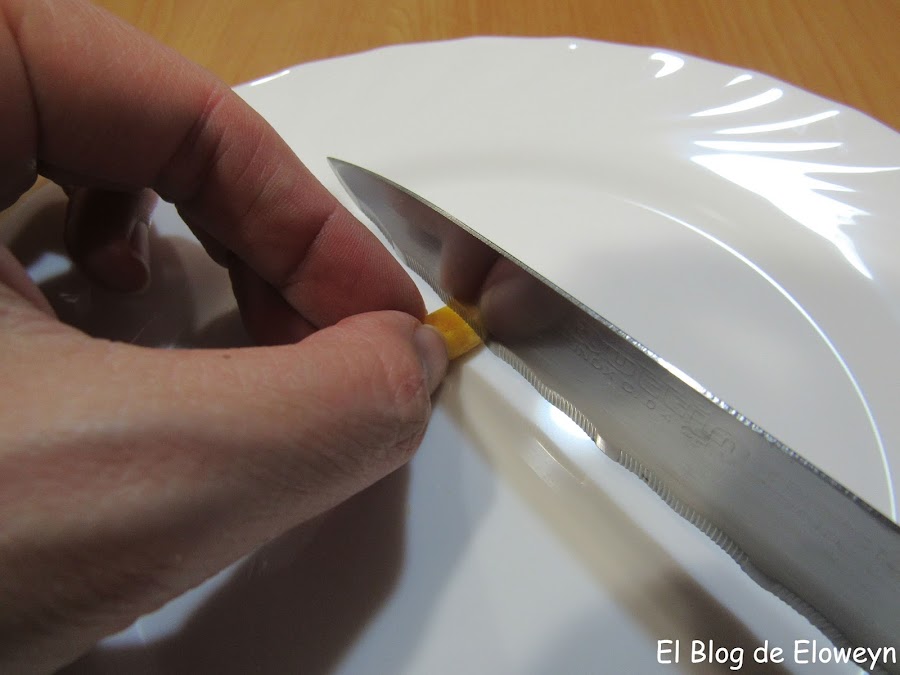 Hacemos una lengua bífida cortando una cuña en el extremo más puntiagudo de las dos fresas (o lenguas... jejeje).